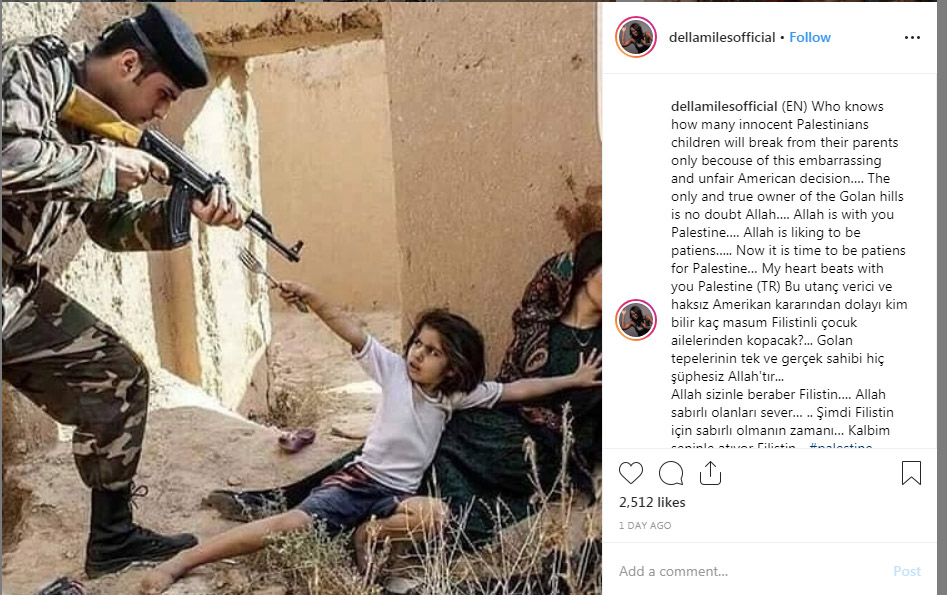 “Siapa yang tahu berapa banyak anak Palestina yang tidak bersalah akan terlepas dari orangtuanya hanya karena keputusan Amerka yang memalukan dan tidak adil ini. Satu-satunya pemilik Bukit Golan adalah Allah, Allah menyertaimu Palestina, Allah menyukai orang-orang sabar, sekarang saatnya untuk Sabar Palestina. Hatiku berdetak bersamamu Palestina,” tulisnya.